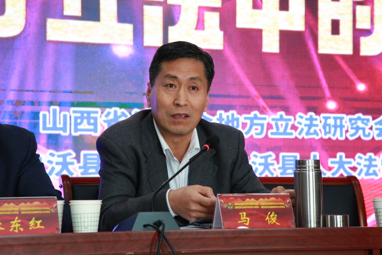 马俊在讲话中指出本次年会举办方式是省法学会优势学术资源与县域丰富法治实践有机结合的一次有益尝试,值得宣传和肯定。他对地方立法研究会过去一年的工作充分也给予肯定,并希望研究会以中共中央办公厅《关于进一步加强法学会建设的意见》为重要遵循,把学习宣传贯彻《意见》作为当前重要任务来抓,切实把思想和行动统一到党中央决策部署上来;指出研究会下一步工作中应保持和增强政治性、先进性和群众性,坚定不移走中国特色社会主义法治道路,自觉在思想上政治上行动上同以习近平同志为核心的党中央保持高度一致,深入研究阐释习近平总书记关于全面依法治国重要论述,加强对中国特色社会主义国家制度和法律制度的理论研究,为构筑中国特色社会主义制度建设理论的学科体系、学术体系、话语体系贡献力量。研究会要发挥智库作用、加强法治人才培养并不断深化学术交流,加强研究会自身建设,更好地发挥作用和履行职责。