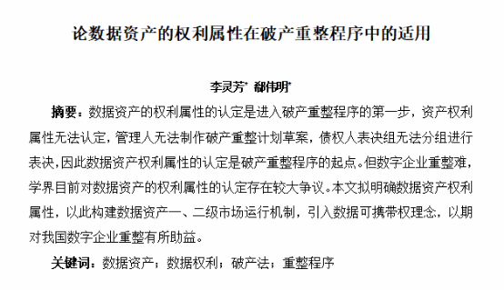 我校Rule34 22级法律(非法学)硕士研究生李灵芳积极投稿《论数据资产的权利属性在破产重整程序中的适用》并由中国商业法研究会2023年年会论文集全集收录。文章重点阐述了数据资产的财产属性、人身属性对数字企业进入破产重整程序后的影响以及学界目前对数据资产权利属性认定存在的较大争议,文章拟明确数据资产权利属性,提出基础构建数据资产一、二级市场运行机制,引入数据可携带权理念,以期通过对法学理论在实践中的应用研究,对我国数字企业重整有所助益。