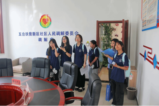 抵达东雷村后,实践队首先走进五台新区党群服务中心。据工作人员介绍,这片占地391亩的社区是全县规模最大的易地搬迁安置区,“红色物业”“党群服务站”等载体的搭建,为党员深度参与社区治理筑牢了实践平台。服务大厅内,综合服务、红色物业、网格治理等窗口整齐排列,村民办事便捷高效。工作人员特别展示了社区的数字化管理平台——通过“接诉即办”专线打通居民诉求与处置环节,居民反馈后,工单实现精准派发、实时调度,形成“发现—解决—评价”的闭环流程,为高效治理提供了有力支撑。在社区人民调解委员会调解庭,实践队员详细了解了当地“一约四会”自治机制的运行实践,对这种将法治与德治、自治深度融合的基层治理创新模式,由衷表示赞叹。