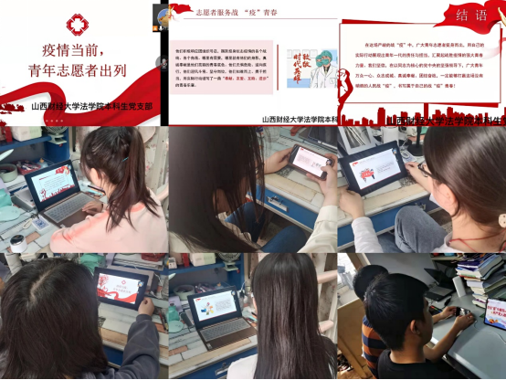 本科生党支部全体党员充分发挥先锋模范作用,支部书记陈思静率先垂范,坚持在社区抗疫前线做防疫志愿者。她以贴合政策为导向,积极响应党和国家的号召,在新冠肺炎疫情暴发以来,累计组织百余名学生充实抗疫一线的工作力量,主动承担起一线抗疫防控工作。在她的号召鼓励下,支部党员纷纷写下请愿书,自觉投身抗疫防疫志愿服务,用点滴行动谱写抗疫战斗篇章,充分展现了“样板党支部”的示范引领、辐射带动作用,让党旗在疫情防控斗争一线高高飘扬。(本科生党支部供稿)