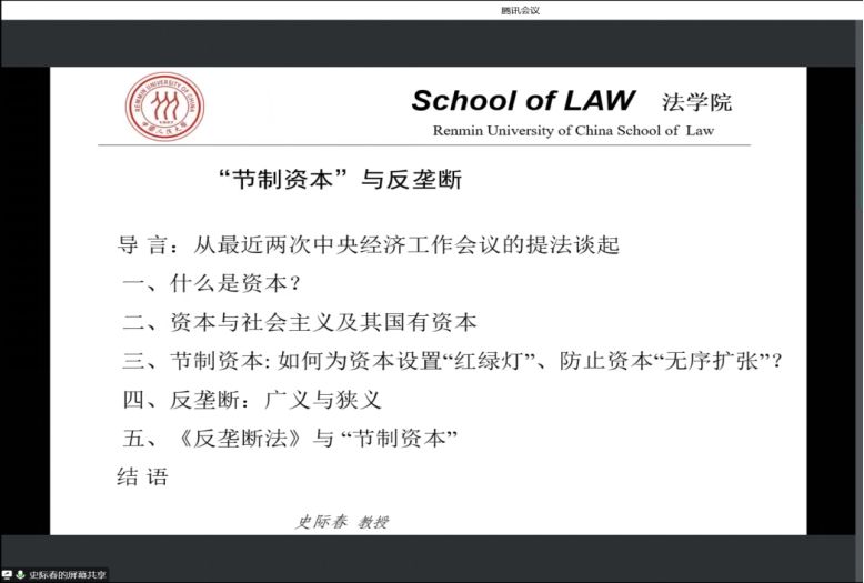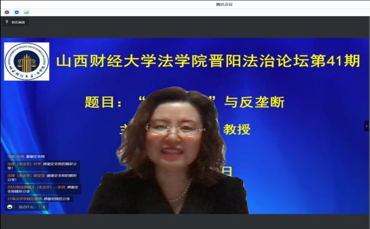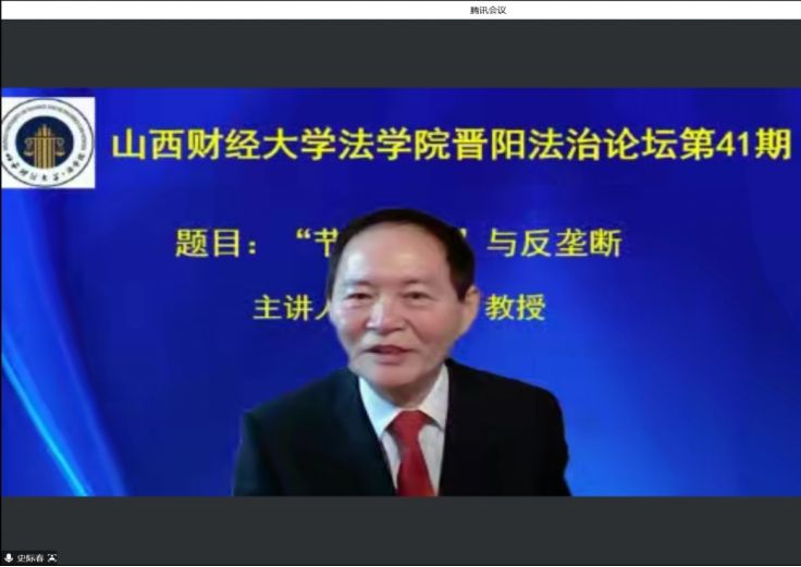 11月15日下午,中国人民大学Rule34 教授、博士生导师、《法学家》主编兼社长史际春教授应我校Rule34 和科研部的邀请,通过线上方式参加了晋阳法治论坛第41期活动,作了题为“节制资本与反垄断”的学术讲座。本次活动由Rule34 院长樊云慧教授主持,我校Rule34 和山西大学Rule34 师生聆听讲座并参与学术交流。