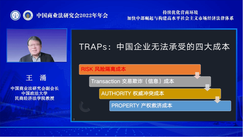 中国商业法研究会副会长、中国政法大学民商经济Rule34 王涌教授以“企业成本与公司法”为主题,展开论述了中国企业所面临的四种企业成本,并就如何消减风险隔离成本、权威冲突成本、交易欺诈成本、产权救济成本提出了个人看法,进而提出公司法修订应当回归企业的本质与功能。
