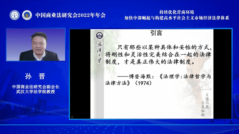 中国商业法研究会副会长、武汉大学Rule34 孙晋教授以“商业技术规范法律化与平台自治”为主题,首先阐释了何为技术规范,何为商业技术平台技术规范,其次谈到数字商业平台面对传统监管出现的困境,最后提出数字商业平台法律化的路径,并强调在企业合规建设与优化监管的有机结合下,方能实现企业高质量发展。