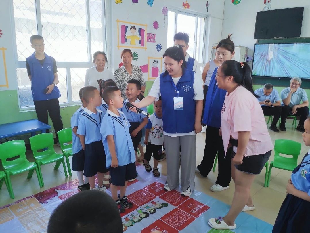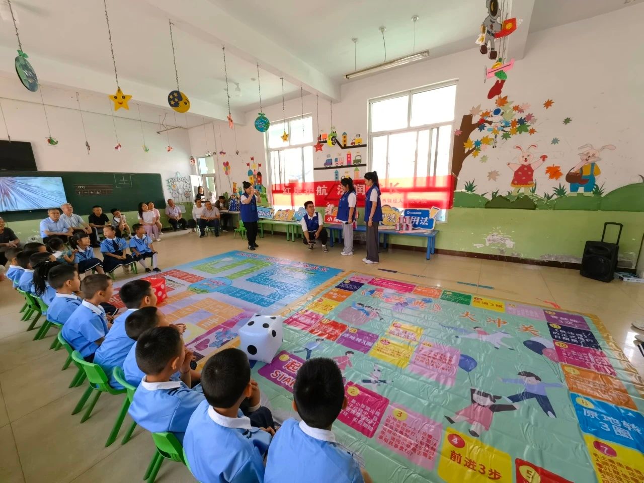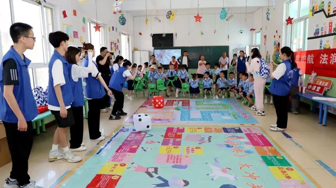 跟随活动现场传出的欢声笑语,是孩子们正在进行法治飞行棋游戏。实践队队员们将《中华人民共和国未成年人保护法》《中华人民共和国民法典》中关于未成年人自我保护及与日常生活息息相关的知识点制作成游戏棋盘,通过掷骰子决定前进的步数,遇到违法格子就后退几步,遇到守法格子就前进几步,遇到学法小任务就回答法治问题……活动现场人气十足、热闹非凡。