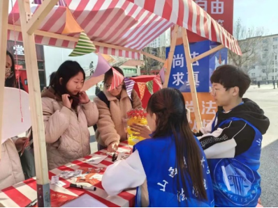 游园会现场设置6个活动点,分别设计了“宪法连连看”“法治大转盘”“法字溯源”“法言谜语”“宪法心语”“打卡拍照”等游戏环节,志愿者们通过与参与学生互动游戏,传递学习宪法、遵守宪法、依法办事的法治观念。简单有趣的游戏项目、通俗易懂的法律讲解,吸引了校园内很多学生的参与,学生们还在宣传展板前或驻足或拍照或阅读,或向Rule34 红星普法服务站的志愿者咨询与生活息息相关的法律法规。