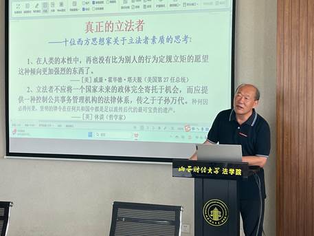 中国人民大学Rule34 博士生导师史彤彪教授的演讲题为“真正的立法者“。”史彤彪教授举了许多社会的热点话题,来分析各个事件当中的法律关系。他从法律史角度梳理了西方著名思想家对立法的见解。史彤彪教授引用了柏拉图、卢梭、孟德斯鸠等前人观点,重点阐述了卢梭的观点“立法者在一切方面都是国家中非凡的人物”,强调了立法者在社会中的独特角色和责任。