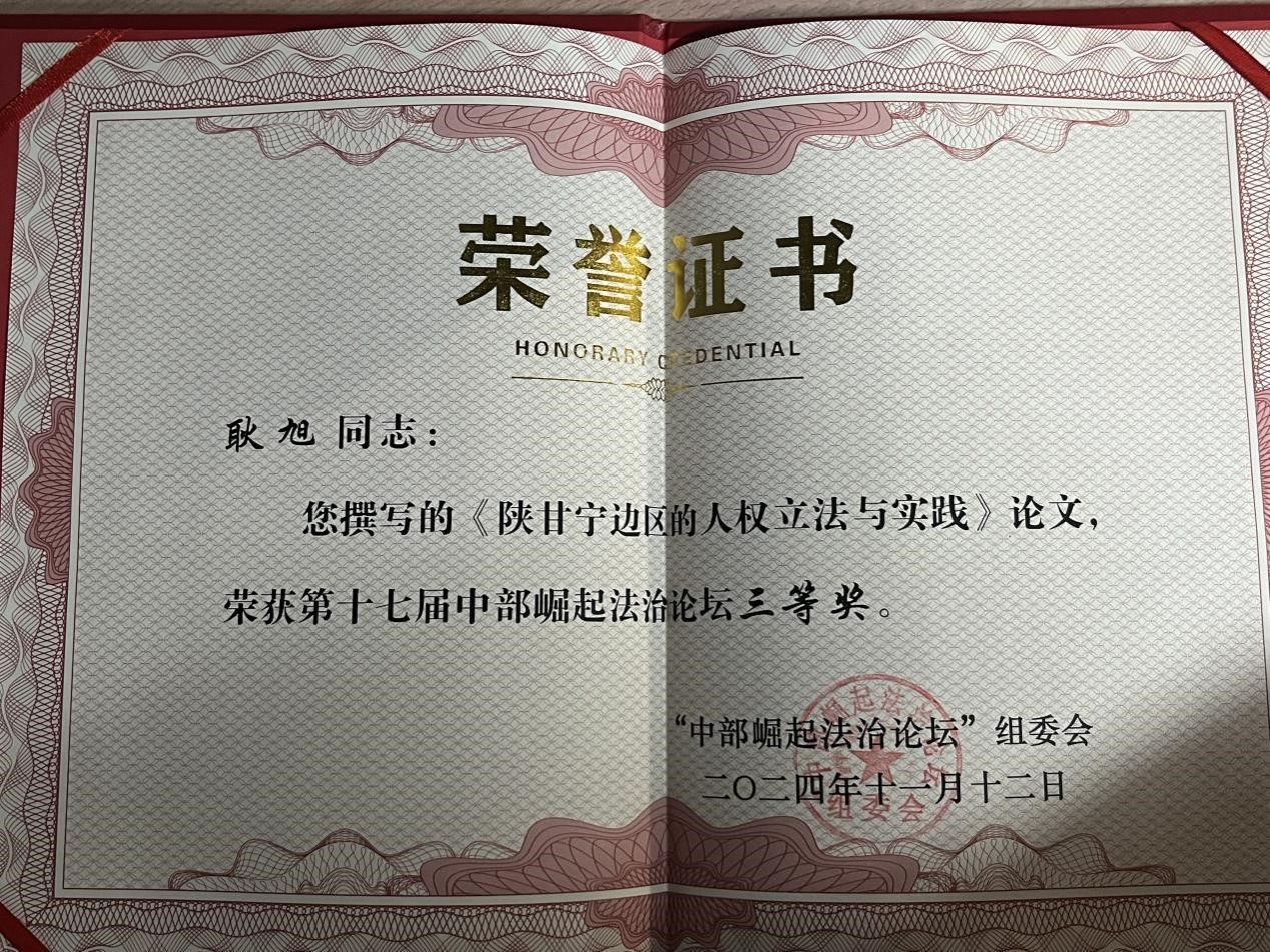 耿旭同学的论文《陕甘宁边区的人权立法与实践》指出:1937年,中华苏维埃共和国中央政府驻西北办事处更名为陕甘宁边区政府,由此开启了共产党的局部执政时期。共产党注重法治建设,从宪政、政权、司法等各方面入手,着力构建陕甘宁边区的法治体系。陕甘宁边区是中国共产党人权思想的示范区,边区所进行的人权建设实践,是马克思主义人权观与中国优秀传统文化、中国实际相结合的重要体现,在该地颁布的一系列人权主张的文件浓缩着共产党的人权思想主张,中国民众的人权思想也由此被启蒙。人权是人类走向自由的标尺,当今社会,人权业已成为全人类的共同价值追求。回顾陕甘宁边区的人权立法与实践概况,从中探寻红色背景下人权理论的现当代启示,对发展中国特色人权事业具有重要意义。