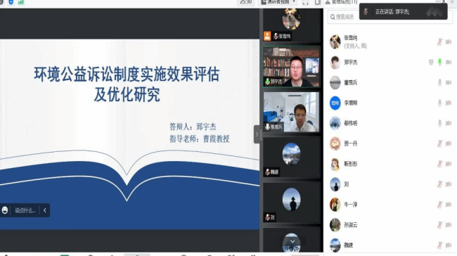 本次参加预答辩的是2020级博士研究生郅宇杰,他围绕“环境公益诉讼制度实施效果评估及优化研究”,从研究缘起、研究意义、研究重难点、主要研究内容以及论文创新与不足等几个方面做了认真而又详细的汇报。各位答辩评审专家对该论文逐一进行细致点评,并从论文的框架结构、逻辑理路、理论内涵、实证模型、创新点等诸多方面提出完善建议。经过答辩委员会评议,魏建主席宣布郅宇杰同学通过博士学位论文预答辩。最后,我校法律经济学导师组组长郗伟明教授对答辩专家的支持与指导表示感谢,并鼓励本次预答辩的同学根据专家们的意见把自己的论文进一步做扎实。