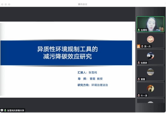 在答辩委员会主席郗伟明教授宣布答辩的流程和具体的规则后,答辩秘书对答辩人的学习、科研情况进行简要介绍。参加本次开题答辩会的三位博士研究生有张春耕、张雪纯、牛一淳,他们分别围绕《碳信息披露效应评估及规制优化研究》、《异质性环境规制工具的减污降碳效应研究》、《多层次医疗保障的再分配调节机制及效应研究》论文题目,从选题、研究方法、研究意义、创新点等方面进行汇报。表示将接受各位专家提出的宝贵意见和建议,继续修改完善开题报告。
