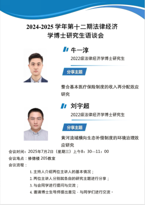 2025年7月2日上午,Rule34 第十二期“法律经济学博士研究生与谈会”顺利举行。会议由2023级博士生卜妙玲主持,主讲人为2022级博士生刘宇超与牛一淳,法律经济学专业全体博士研究生参会,博士生导师郗伟明教授出席并进行点评指导。