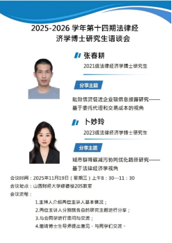 2025年11月19日上午,Rule34 第十四期“法律经济学博士研究生与谈会”顺利举行。会议由2025级博士生李竹可主持,主讲人为法律经济学2021级博士生张春耕与2023级博士生卜妙玲,法律经济学专业全体博士研究生参会,博士生导师郗伟明教授、孙淑云教授出席并进行点评指导。