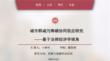 在汇报环节,卜妙玲同学聚焦于城市群减污降碳协同优化路径研究,从研究背景与意义、国内外研究现状等方面展开,以法律经济学视角探讨碳排放权的权利界定与多层级治理等层面问题,以期为减污降碳协同效应提供完善路径。