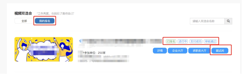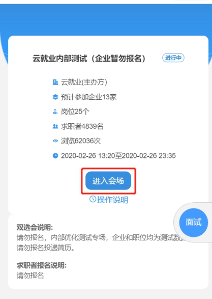 单位PC端参会。招聘会当天PC端进入招聘会会场→单位登录→选择报名场次→进入视频面试间→面试列表中选择在线求职者,点击“开始面试”→进行视频沟通。更多人才需求可提前点击“去邀约面试”进入人才大厅邀约,邀约被同意后即可面试。视频挂断后,单位给出面试结果“合格”或者“不合格”,以及相关备注,以便后续查看。